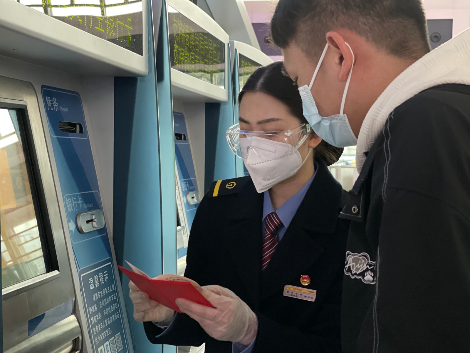 车站工作人员在售票厅服务旅客 (魏伟 徐晨茜 摄)