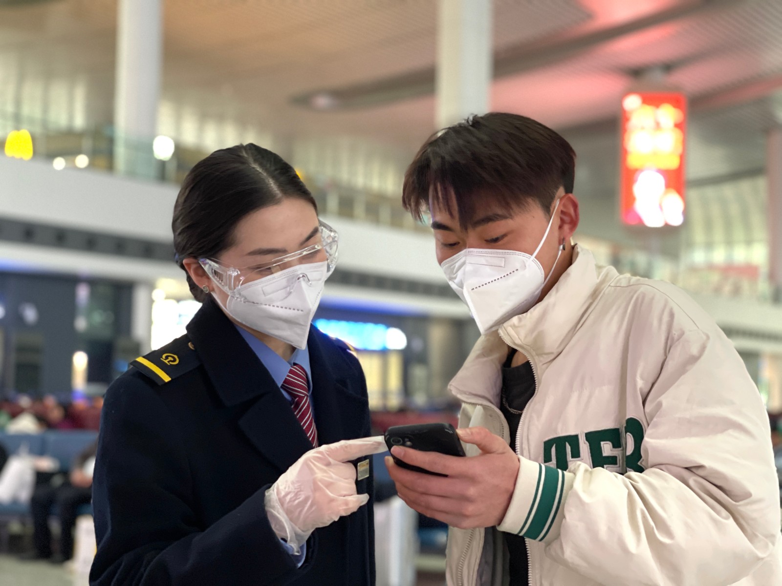 车站工作人员在候车厅服务旅客 (魏伟 徐晨茜 摄)